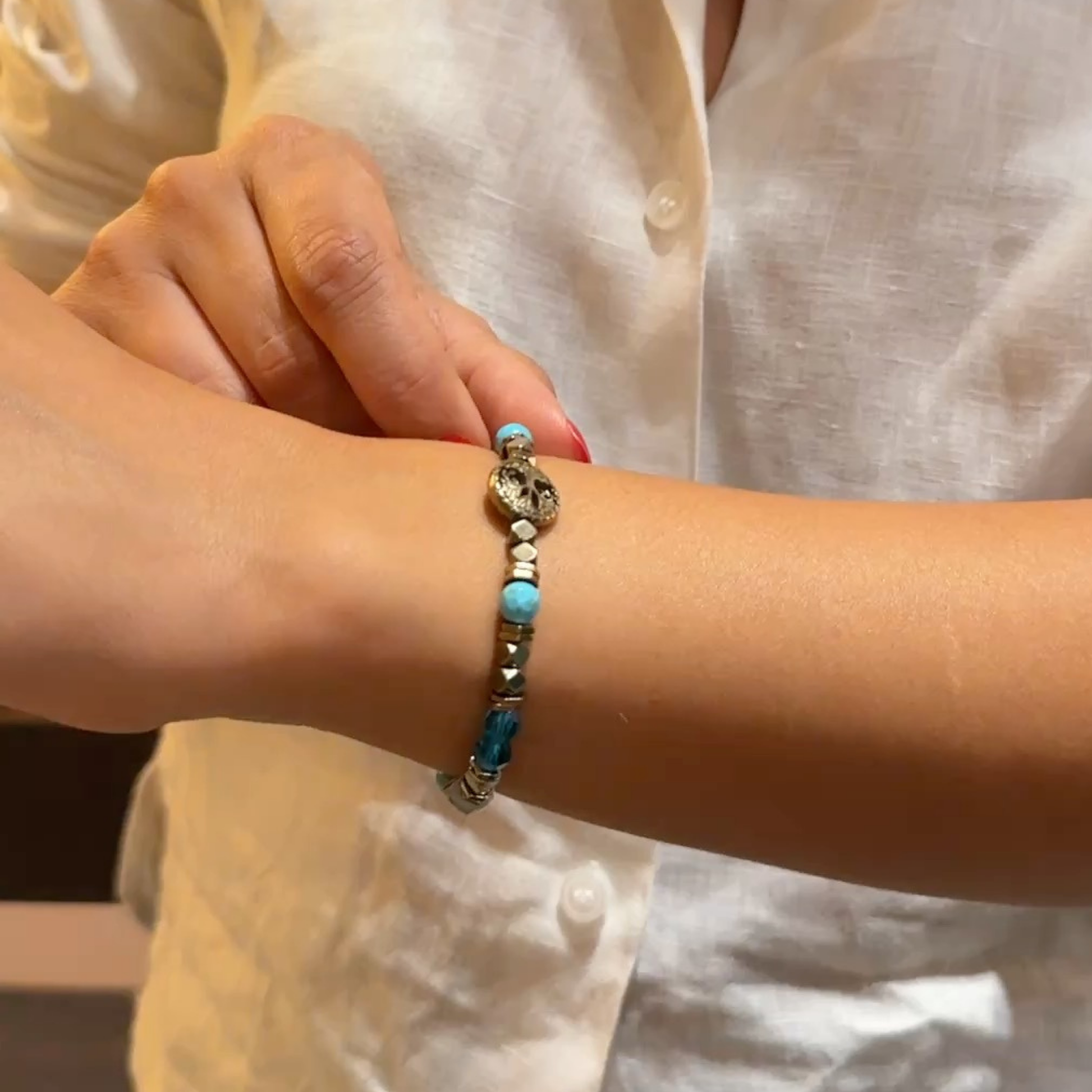 Merkezinde yer alan yaşam ağacı charm, 7 çakrayı temsil eden Swarovski taşlarla süslenmiştir. Bu eşsiz detay, yaşam enerjisini ve ruhsal dengeyi simgeler. Bilekliği tamamlayan Turkuaz, Akuamarin ve Hematit taşları ise tasarıma hem estetik hem de güçlü bir enerji katmaktadır.