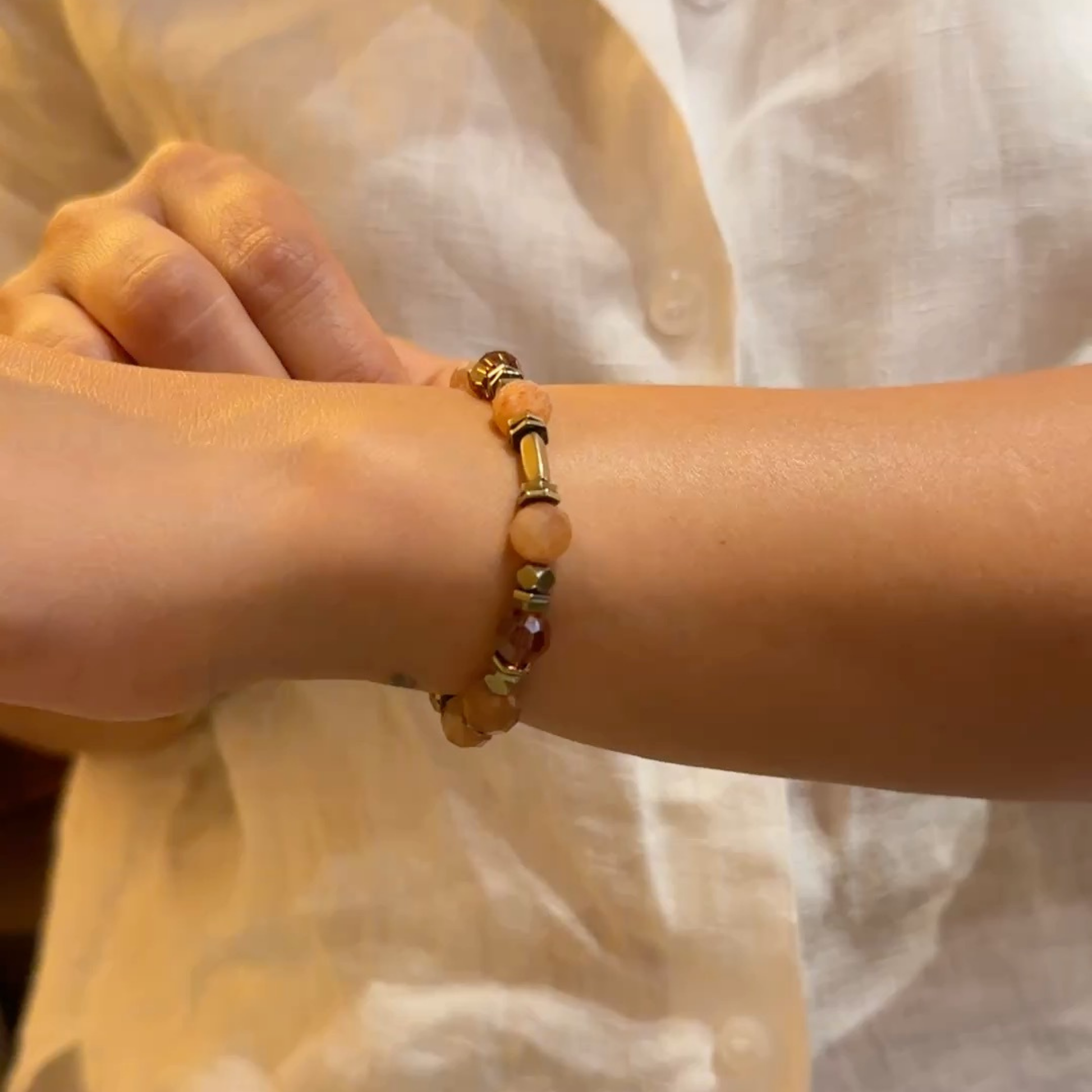 Merkezinde yer alan hayat ağacı charm, Swarovski kristalleriyle süslenmiştir. Bu eşsiz detay, ruhsal ışığı ve zarafeti simgeler. Bilekliği tamamlayan Sunstone, Swarovski Kristal ve Hematit taşları ise tasarıma hem estetik hem de güçlü bir enerji katmaktadır.