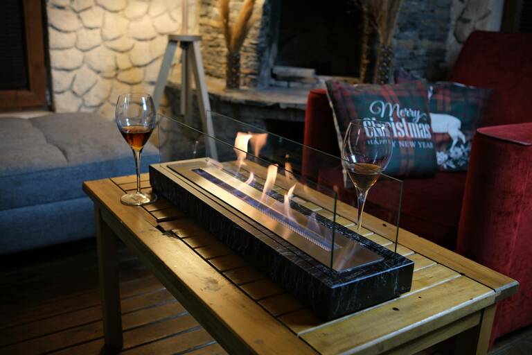 Ürün İçeriği: Mermer desenli metal altlık, 2 adet temperli cam çeper, 304 kalite paslanmaz çelik yakıt haznesi, söndürme aparatı, 1 litre bioethanol şömine yakıtı