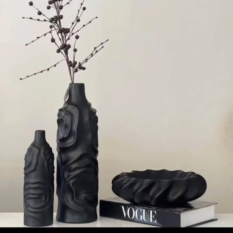 Sanatsal detaylarıyla dikkat çeken bu 3’lü siyah seramik dekoratif set, iki farklı boyda vazo ve bir dekoratif kase/ tabaktan oluşur. Organik kıvrımlı yüzey tasarımıyla modern ve şık bir görünüm sunar. Kuru dallar, pampas çiçekleri veya dekoratif aksesuarlarla uyumlu şekilde kullanılabilir.