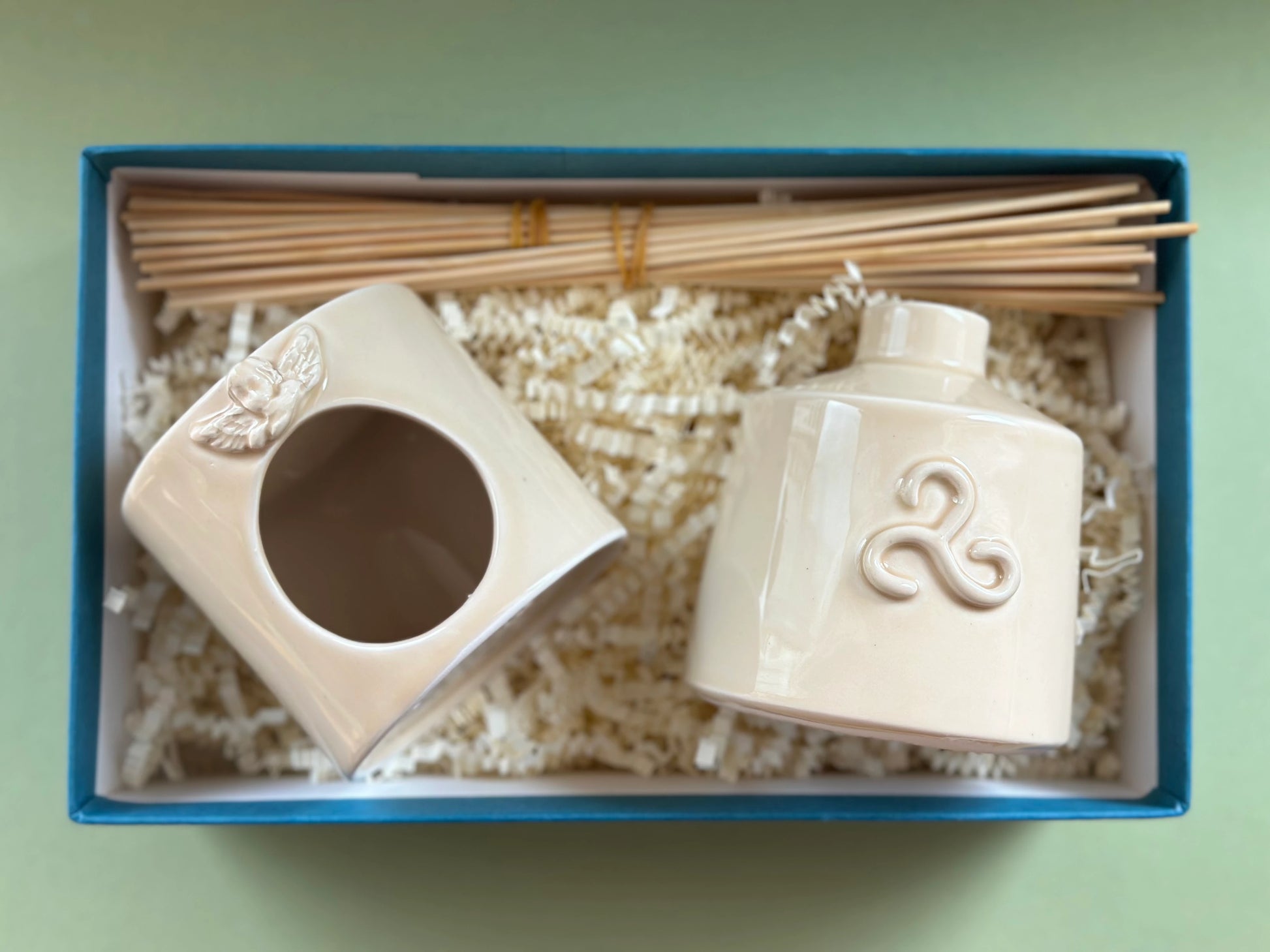 Triskelion & Melek Sembolü El Yapımı Seramik Oda Kokusu Şişesi ve Buhardanlık Seti